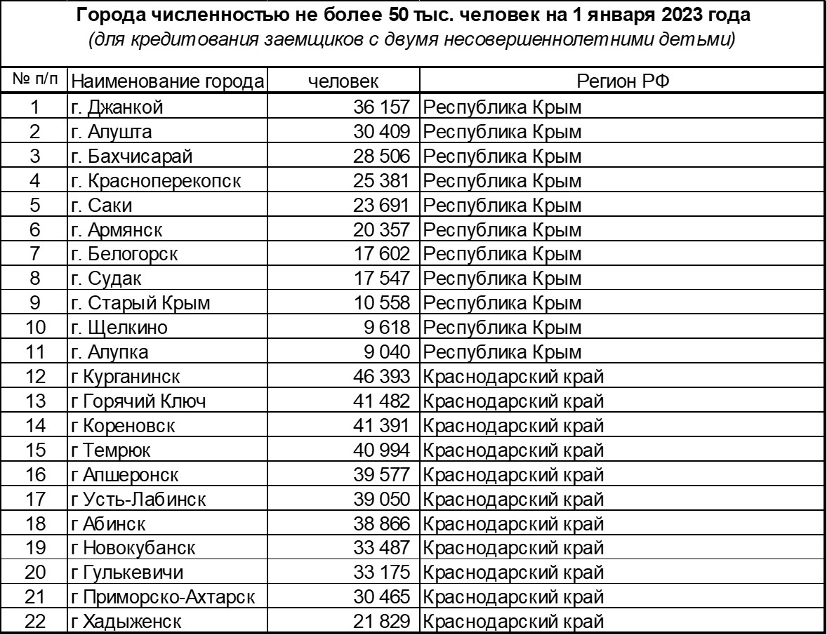 -  семьи с двумя и более детьми до 18 лет (у которых нет детей до 7 лет или ребёнка-инвалида), могут приобрести жильё только на территории малых городов численностью до 50 тысяч человек или в 35 регионах, где нет ограничений по численности населения (в данном случае прописка заемщика не имеет значения, имеет значение, - где приобретается объект!)